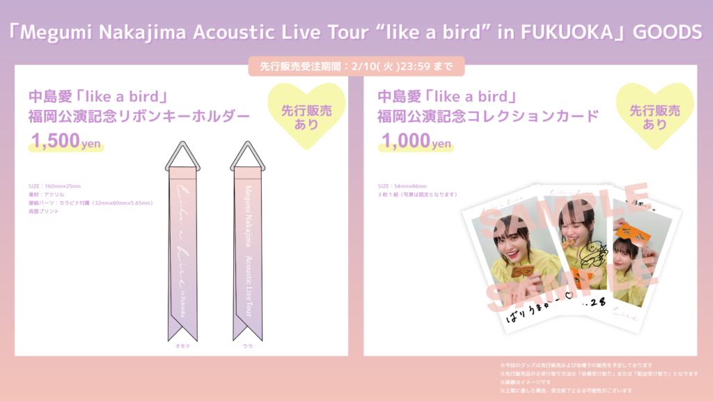 「Megumi Nakajima Acoustic Live Tour “like a bird” 」オリジナルグッズ&2/28(土)福岡公演記念グッズ 先行予約販売のお知らせ!
